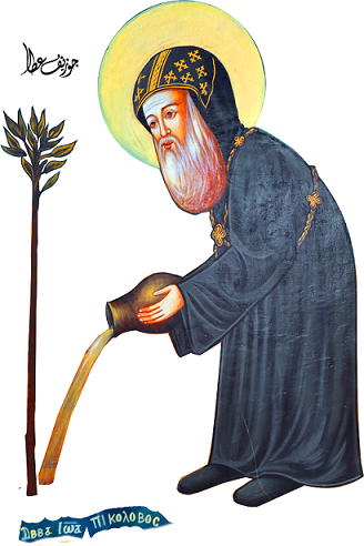On this day, the great light and saint, the hegumen Abba John (Yoannis) Colobos (the Short), departed. He was a native of Betsa in upper Egypt and he had one brother. His parents were righteous and God-fearing people, rich in faith and good deeds.